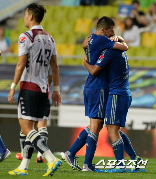 지난해 7월3일 K-리그 클래식 대전전에서 정대세의 골직후 포옹하며 기쁨을 나누고 있는 스테보.