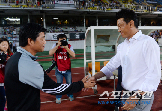 2014 프로축구 K리그 클래식 21라운드 성남FC와 부산아이파크의 경기가 17일 성남탄천종합운동장에서 열렸다. 경기번 부산 윤성효 감독과 성남 이상윤 감독이 인사를 나누고 있다. 성남=최문영 기자 deer@sportschosun.com
