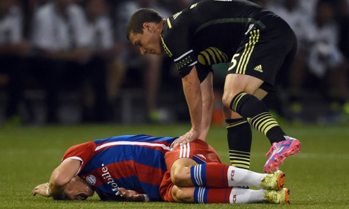 | 슈바인슈타이거가 MLS 올스타와의 친선경기 도중 깊은 태클을 당해 고통스러워하고 있다. ⓒAFPBBNews = News1 |