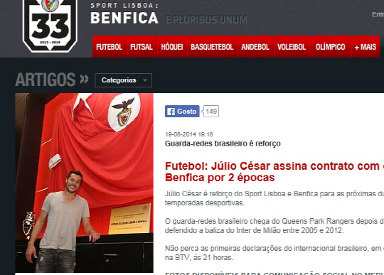 브라질 국가대표 골키퍼 줄리우 세자르(34)가 벤피카로 이적했다.