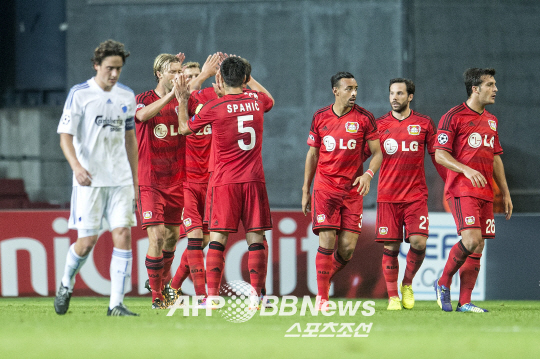| 20일 코펜하겐을 상대로 골을 넣은 레버쿠젠 선수들이 기쁨을 나누고 있다. ⓒAFPBBNews = News1 |