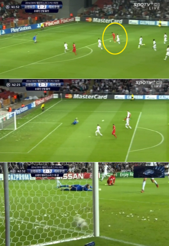 손흥민은 20일(이하 한국시간) 덴마크 코펜하겐의 파르켄에서 열린 코펜하겐과의 2014-2015 UEFA 챔피언스리그 플레이오프 1차전에서 전반 42분 양팀 2대2 균형을 무너뜨리는 결승골을 터뜨렸다. 레버쿠젠은 손흥민의 활약에 힘입어 코펜하겐을 3대2로 꺾었다.