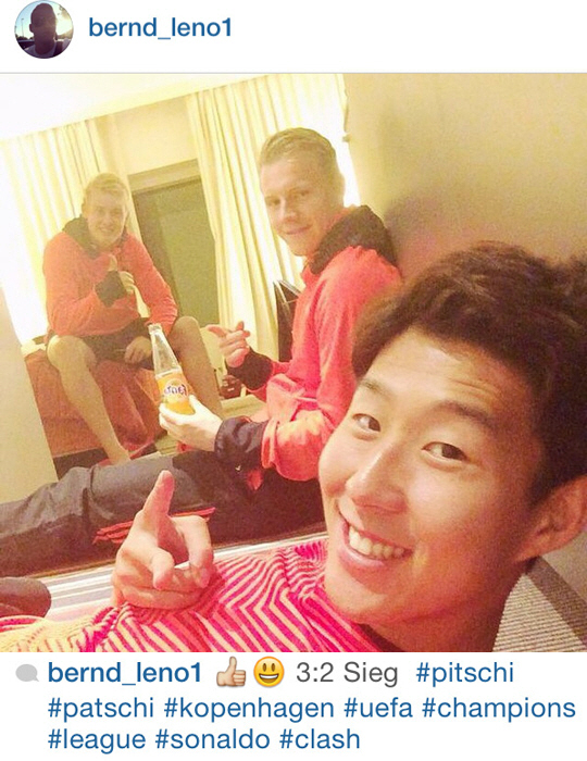 레노는 글과 함께 손흥민, 율리안 브란트(18)와 함께 편안하게 쉬고 있는 사진도 함께 올렸다. 촬영 각도상 손흥민이 다른 두 사람을 배경으로 찍은 셀카로 보인다.