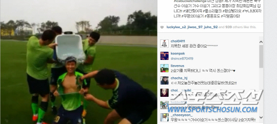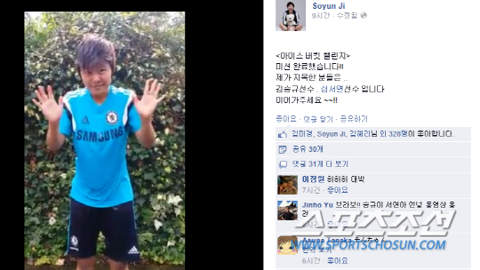 19일 김태륭 해설위원이 '라이언킹' 이동국(전북)과 지소연, 박문성 해설위원 등 3인을 지명했다. 지목을 받은 '지메시' 지소연(24·첼시레이디스)이 런던에서 즉각 동참을 선언했다. 미션 완수 직후 자신의 페이스북에 인증 동영상을 찍어올렸다. "한국여자대표팀 지소연입니다. 아이스버킷 챌린지에 동참하게 돼 영광입니다. 루게릭 병을 앓고 계신 분들에게 조금이나마 힘이 됐으면 좋겠습니다"라는 코멘트 직후 시원하게 아이스버킷을 뒤집어썼다. 지소연은 아이스버킷 미션을 '절친' 김승규(울산)와 심서연(고양대교)에게 넘겼다. "'한국대표팀 수문장' 김승규선수 '여자대표팀 얼짱' 심서연선수 부탁드립니다" 라며 두손을 힘차게 흔들었다. 20일 김승규와 심서연은 곧바로 '얼음 샤워' 미션을 수행했다. 김승규는 "릴레이뿐 아니라 많은 분들의 도움이 함께하길 기원한다"는 메시지와 함께 '말년 병장' 이근호와 '미녀 개그맨' 허민, '노래하는 파이터' 서두원에게 바통을 넘겼다.심서연은 박종우(광저우부리) 박주호(마인츠) '여자축구 에이스' 김혜리(현대제철)에게 바통을 넘겼다. 김혜리는 즉각 미션을 수행한 후 윤석영(퀸즈파크레인저스) 홍 철(수원) 임선주(현대제철)를 지목했다. '윤덕여호 수비의 핵' 임선주는 여자농구 미녀스타 김단비와 함께 대표팀 동료인 김나래(현대제철) 최유리(울산과학대)를 지목했다. 독일에서 미션을 명받은 박주호(마인츠) 역시 지체없이 임무를 수행했다 .시원한 얼음물 샤워 인증샷을 올린 후 "같은팀 동료인 구자철, 오카자키신지, 그리고 지성이형"을 지목했다.