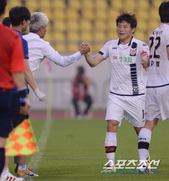 13일 오후 성남 탄천 종합운동장에서 현대오일뱅크 K리그 클래식 2014 성남과 제주의 경기가 열렸다. 전반 역전골을 성공시킨 제주 황일수가 박경훈 감독과 환호하고 있다. 성남=김경민 기자 kyungmin@sportschosun.com / 2014.07.11.