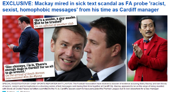 맥케이 감독의 애제자로 꼽혔던 김보경(25·카디프시티)까지 거론되어 충격을 주고 있다. 맥케이 감독은 김보경이 카디프 현지에 도착하는 날 무디에게 '빌어먹을 칭키(F****** chinkys)'라는 문자를 보냈다. 칭키는 영국인들이 아시아인을 비하할 때 부르는 은어다. 무디 역시 '동양인은 카디프 어디서나 돌아다니는 것으로 충분하다(There's enough dogs in Cardiff for us all to go around)'고 거들었다. 친분에 의한 단순한 농담을 넘어 인종차별적인 생각과 악의적 시선이 담긴 말들이다. 뿐만 아니라 이들은 선수 영입 과정에서 나이지리아 출신이라는 이유로 '프로필이 좋지 못하다'고 평하는가 하면, 여성 에이전트를 두고는 수위 높은 성희롱 발언까지 서슴지 않았던 것으로 드러났다. 사적으로 주고 받은 말들로 치부하기엔 내용이 적나라하다. 이들이 유색 인종을 바라보는 차별적인 시선의 심각성도 꽤 크다.