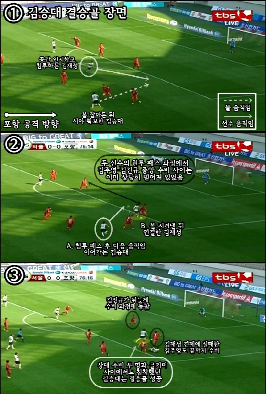 일리는 있다. 최근 빈공 속에서도 무실점을 이끈 골키퍼 및 수비진에 대한 믿음이 컸을 터. 여기에 후반기 들어 가장 '포항다운 모습'을 보인 공격진의 플레이에도 고무됐을 것이다. 이명주의 부재가 아쉽긴 해도 조직의 힘이 살아난다면 충분히 해볼 만하다는 생각이 아니었을까. 포항은 지난 4월에도 이명주의 공백(경고 누적)에 흔들리지 않았다. 오히려 공간을 인지하고 뛰어드는 특유의 패스웍으로 김승대가 결승골을 뽑아내 2006년 8월 이후 단 한 번도 이기지 못한 서울 원정 징크스를 깼다(하단 캡처 참고, 4월 20일 9라운드 0-1 포항 승. 물론 현 서울의 쓰리백 완성도는 당시와 큰 차이가 있다).