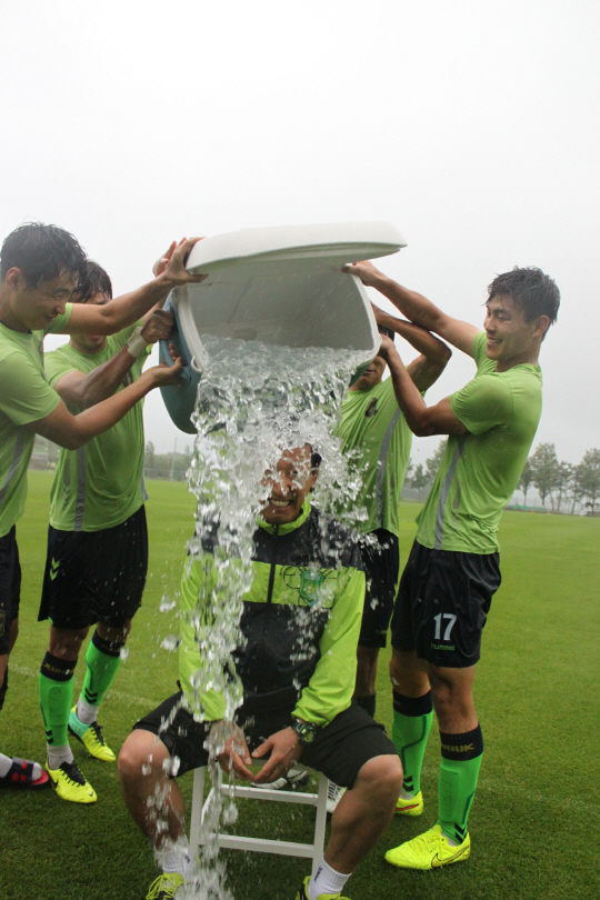 전북 완주의 클럽하우스에서 진행된 얼음물 샤워에 전북 선수들이 동원됐다. 이동국과 김기희가 얼음물통 '도우미'를 자처했다. 결국 언제 어디서나 한결 같았던 최 감독의 '이대팔' 헤어스타일도 물폭탄에 풀어지고 말았다.