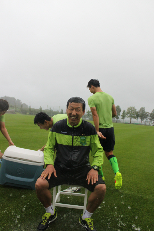 전북은 21일 최 감독의 아이스 버킷 챌린지 참여 모습을 공개했다. 최 감독의 얼음물 샤워는 '애제자'인 이동국이 최 감독을 지명하면서 시작됐다.