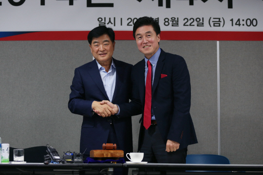 ◇권오갑 한국프로축구연맹 총재(왼쪽)와 박상균 이랜드스포츠 대표이사가 22일 서울 신문로 축구회관에서 열린 프로연맹 이사회에서 이랜드 창단 승인이 마무리 되자 악수를 나누고 있다. 사진제공=한국프로축구연맹