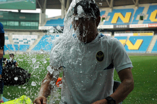 하지만 긴장한 코칭스태프가 얼음물을 너무 천천히 부은 탓일까. 얼음물 세례를 받던 김 감독은 도중에 일어나 "부으려면 한 번에 부어야지 이렇게 천천히 부으면 나 죽으라는 거냐"며 핀잔을 줘 주위에 있던 선수들이 웃음을 터뜨리기도 했다. 김 감독은 얼음물 세례를 받은 후 다음 도전자로 울산현대 조민국 감독, 이천수, 유 현을 지목했다.