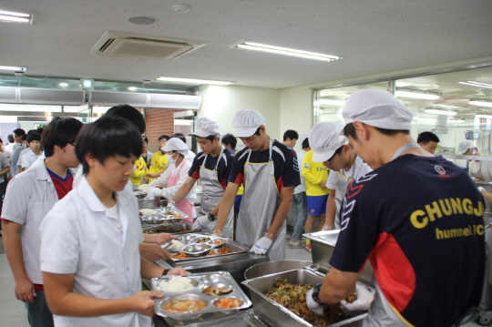 충주는 27일 충주시 안림동에 위치한 대원고를 방문, 배식 봉사와 축구 클리닉을 진행했다.