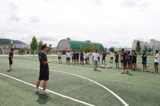 이후 충주 선수들은 5교시 체육수업을 통해 축구 클리닉을 열였다. 약 40여명의 학생들을 대상으로 축구의 기본기를 직접 지도했다.