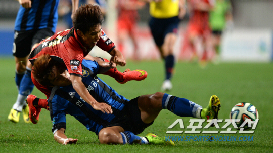 FC서울과 인천 유나이티드의 K리그 클래식 2014 21라운드 경기가 16일 서울월드컵경기장에서 열렸다. 서울 윤일록이 인천 이윤표와 볼을 다투다 넘어지고 있다. 상암=허상욱 기자 wook@sportschosun.com/2014.08.16/