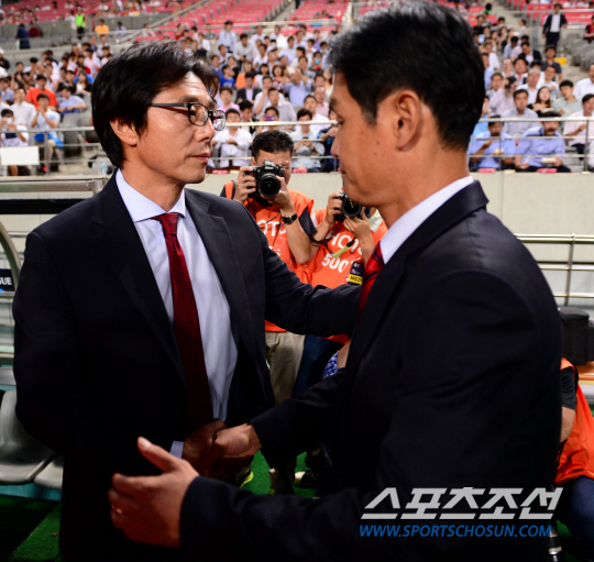 승부차기 순서에도 비밀이 있었다. 에벨톤→오스마르→김진규→고명진→몰리나 순이었다. 2-0으로 앞선 순간 4번째 키커는 고명진이었다. 하지만 한 골만 넣으면 끝이었다. 페널티킥이 뛰어난 몰리나를 전진 배치시켰고, 적중했다. 승리가 확정된 순간 최 감독은 그라운드에 키스했다. 선배 황 감독과는 한때 절친이었다. 종종 소줏잔도 기울였지만 올해 끊겼다. 라이벌이라는 시선은 두 감독을 분리시켰다. 그러나 경기 후 전화 통화로 서로 격려하면 흉금을 털어냈다. "감독대행부터 시작해 지도자로서 거뒀던 가장 슬픈 승리다. 황선홍 감독과 치열한 경쟁을 예상했는데…." '황새'를 걱정한 '독수리'의 솔직한 심경이었다. 경기는 끝이 났다. 서울이 이겼다. "우리가 이길 것이라는 확신이 승리의 원동력이었다. 서울이 충분히 경쟁력이 있다는 걸 보여줬다. 이 자신감을 갖고서 상대가 누가 됐든 우리가 갈 길만 걸어가겠다."