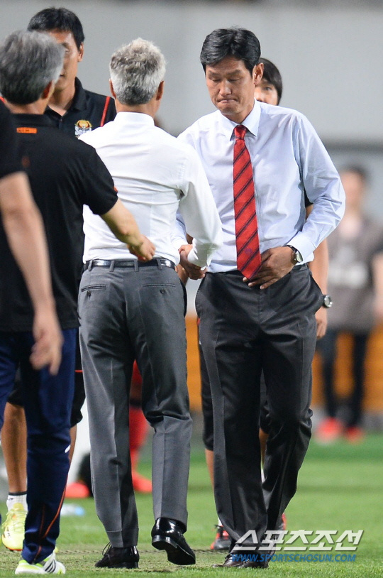 2014 프로축구 K리그 클래식 FC서울과 제주 유나이티드의 경기가 31일 서울 월드컵경기장에서 열렸다. 0대0 무승부로 경기를 마친 FC서울 최용수 감독과 제주 박경훈 감독이 인사를 나누고있다. 상암=최문영 기자 deer@sportschosun.com /2014.08.31/