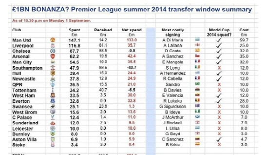 영국 일간 데일리메일은 구단별 이적료를 잠정집계한 자료를 공개했다. 아직 진행중인 계약이 있는 만큼 수치의 변화가 있을 수 있지만, 올시즌 영입의 전체적인 분위기를 파악하는 데는 손색이 없는 자료다.