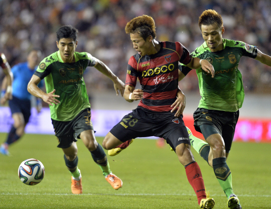 ◇전북 미드필더 신형민(오른쪽)이 16일 포항 스틸야드에서 펼쳐진 포항과의 2014년 K-리그 21라운드에서 포항 미드필더 손준호(가운데)의 드리블을 저지하고 있다. 사진제공=포항 스틸러스