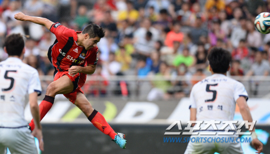 2014 프로축구 K리그 클래식 FC서울과 제주 유나이티드의 경기가 31일 서울 월드컵경기장에서 열렸다. FC서울의 몰리나가 제주 문전에서 헤딩슛을 시도하고 있다. 상암=최문영 기자 deer@sportschosun.com /2014.08.31/ |