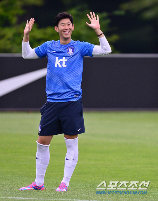 한국 A대표팀이 2일 오후 경기도 파주 NFC(트레이닝센터)에서 훈련을 가졌다. 손흥민이 훈련 도중 환하게 웃고 있다. A대표팀은 이날 소집돼 오는 5일과 8일 각각 베네수엘라와 우루과이를 상대로 평가전을 치른다. 한편 대표팀 감독 자리가 공석인 가운데 신태용 전 성남 감독이 코치로 9월 A매치서 대표팀을 이끈다. 파주=김경민 기자 kyungmin@sportschosun.com / 2014.09.02.