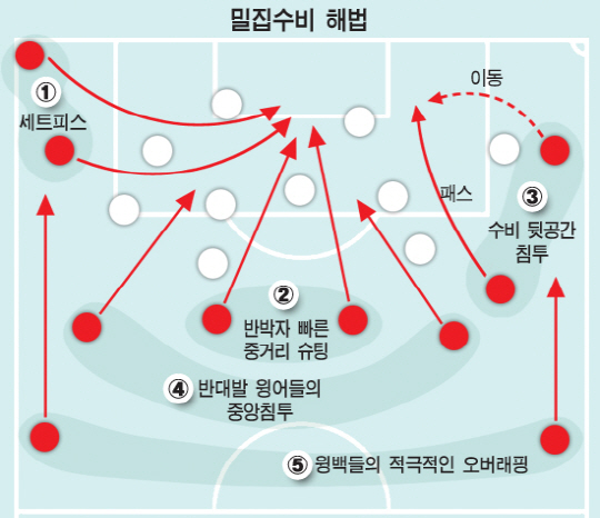 첫째는 측면에 열쇠가 있다. 촘촘하고 조밀조밀한 중앙을 뚫기는 쉽지 않다. 밀집수비에는 측면을 활용한 공격 패턴이 가장 효과적이다. 측면에서 활로를 뚫으면 수비라인이 분산된다. 활발한 오버래핑도 공존해야 한다. 볼은 사람보다 빠르다. 상대 수비가 예측하기 전 측면의 뒷 공간으로 침투해 패스가 연결되면 수비벽을 일순간에 무너뜨릴 수 있다. 자연스럽게 중앙에 공간도 생긴다. 이광종호는 1m96의 고공폭격기 김신욱(울산)을 보유하고 있다. 측면에서 제대로 된 크로스가 연결된다면 기회는 배가된다. 김승대(포항)는 "한국을 상대하는 팀들은 대부분 수비를 내려서 할 것"이라며 "이번 대회에서는 포스트 플레이에 능한 신욱이 형이 있으니 위력적일 것"이라고 기대했다.