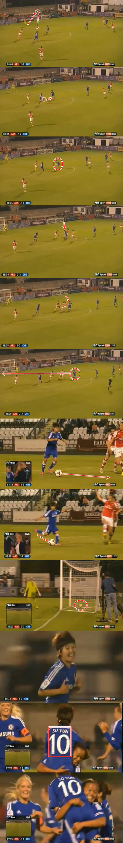 경기는 일진일퇴의 공방을 거듭했다. 첼시는 전반 10분 아스널의 카터에게 선제골을 허용했지만 전반 25분 오기미의 페널티킥 동점골이 터지며 경기는 1-1로 팽팽해졌다. 3분 후인 전반 28분 그로넨의 역전골까지 터지며 2-1로 앞서나갔지만 불과 2분후인 전반 30분 아스널 윌리엄슨의 동점골이 터지며 다시 원점으로 돌아갔다. 후반 종료 직전까지 승부를 가리지 못하며 무승부가 굳어지던 상황, 해결사는 역시 '지메시'였다. 후반 44분 아스널 골키퍼 바이런의 골킥 실수를 놓치지 않았다. 멀리 나가야 할 공이 페널티박스 안에 서 있던 첼시 수비 앞에 뚝 떨어졌다. 곧바로 원터치 패스를 이어받은 지소연은 침착하고 영리했다. 환상적인 드리블로 자신을 향해 몰려든 수비수 3명을 완전히 돌려세운 후 정확한 오른발 슈팅을 상대 골망 구석에 꽂아넣었다. 치명적인 실수에 이어 역전골을 내준 아스널 골키퍼가 망연자실했다. 아스널 출신의 엠마 헤이스 감독이 손뼉을 치며 기뻐하는 장면이 중계화면에 클로즈업됐다. 활짝 웃는 얼굴로 내달리는 지소연을 향해 1992년생 미드필더 스펜서 드루가 달려왔다. 지소연을 번쩍 들어올리며 짜릿한 기쁨을 만끽했다. 극적인 역전골에 첼시 선수들이 한꺼번에 몰려들어 열정적인 세리머니를 펼쳤다.
