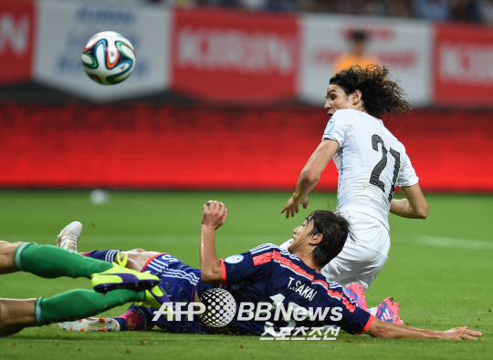 | ◇에딘손 카바니가 5일 일본 홋카이도의 삿포로돔에서 열린 일본과의 평가전에서 수비수 사카이의 마크를 뚫고 선제골을 성공시키고 있다. 삿포로(일본)=ⓒAFPBBNews = News1 |