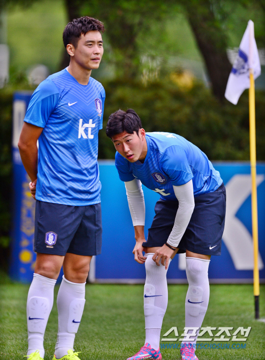 한국 A대표팀이 2일 오후 경기도 파주 NFC(트레이닝센터)에서 훈련을 가졌다. 이동국과 손흥민이 훈련을 기다리고 있다. A대표팀은 이날 소집돼 오는 5일과 8일 각각 베네수엘라와 우루과이를 상대로 평가전을 치른다. 한편 대표팀 감독 자리가 공석인 가운데 신태용 전 성남 감독이 코치로 9월 A매치서 대표팀을 이끈다. 파주=김경민 기자 kyungmin@sportschosun.com / 2014.09.02.