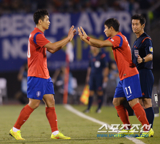 신태용 코치가 이끄는 축구대표팀이 5일 오후 부천종합운동장에서 FIFA 랭킹 29위의 베네수엘라와 친선경기를 벌였다. 두골을 넣으며 대표팀 복귀전을 화려하게 장식한 이동국이 후반 막판 교체되어 나오며 이근호와 손을 맞대고 있다. 부천=정재근 기자cjg@sportschosun.com/2014.09.05/