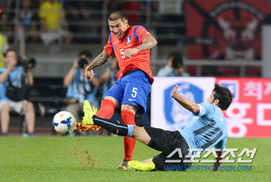 한국축구대표팀과 우루과이 대표팀의 평가전이 8일 고양종합운동장에서 열렸다. 한국의 차두리가 우루과이의 니콜라스 로데이로와 치열한 볼경합을 벌이고 있다. 고양=최문영 기자 deer@sportschosun.com /2014.09.08/