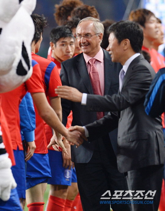 한국축구대표팀과 우루과이 대표팀의 평가전이 8일 고양종합운동장에서 열렸다. 슈틸리케 신임 감독과 정몽규 대한축구협회장이 경기를 마친 대표팀 선수들을 격려하고 있다. 고양=최문영 기자 deer@sportschosun.com /2014.09.08/