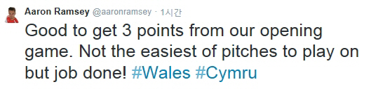 외신이 '3D 그라운드'라는 표현을 쓸 만큼 울퉁불퉁한 최악의 그라운드였다. 램지는 킥을 받아내다 발목을 다쳤다. 후반 추가시간 교체됐다. 크리스 콜만 웨일스 감독은 "24시간 후에야 부상 정도를 정확히 판단할 수 있을 것같다"고 말했다. "발목으로 킥을 받아내다 발목이 돌아간 것같다. 아스널의 주말경기를 위해 애런의 부상이 괜찮기만을 바라고 있다. 향후 24~48시간동안 지켜봐야할 것같다"고 덧붙였다. 램지는 부상에도 불구하고 승점 3점을 따낸 것에 만족감을 표했다. 트위터를 통해 '(유로2016)첫 경기에서 승점 3점을 따내 기분좋다. 경기하기에 최악의 피치였지만, 할일을 해냈다'는 소감을 밝혔다.