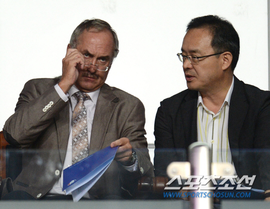 수원 삼성과 울산 현대의 2014 K-리그 클래식 경기가 10일 수원월드컵경기장에서 열렸다. 슈틸리케 신임 축구대표팀 감독이 이용수 기술위원장과 함께 수원 경기장을 찾아 K리그 선수들의 플레이를 지켜보고 있다. 수원=정재근 기자cjg@sportschosun.com