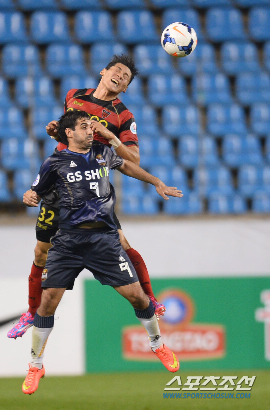 | ◇김형일이 지난달 20일 포항 스틸야드에서 펼쳐진 서울과의 2014년 아시아챔피언스리그 8강 1차전에서 에스쿠데로와 볼을 다투고 있다. 포항=최문영 기자 deer@sportschosun.com |