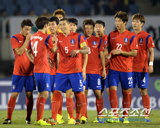 | ◇A대표팀 선수단이 5일 경기도 부천종합운동장에서 가진 베네수엘라와의 평가전에서 3대1로 이긴 뒤 기뻐하고 있다. 부천=정재근 기자cjg@sportschosun.com |