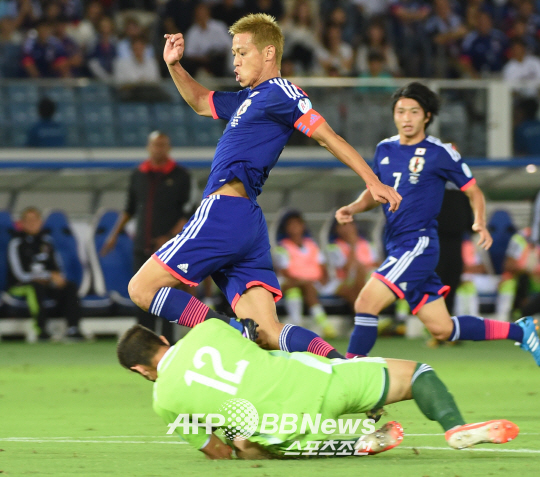 | ◇혼다 게이스케가 9일 일본 요코하마의 닛산 스타디움에서 열린 베네수엘라와의 평가전에서 드리블 하다 골키퍼 방어에 걸려 넘어지고 있다. 요코하마(일본)=ⓒAFPBBNews = News1 |