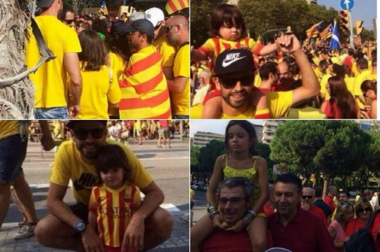 바르셀로나의 카탈루냐 스타 사비 에르난데스와 헤라르드 피케가 자녀와 함께 카탈루냐 독립 거리 시위에 참여했다.