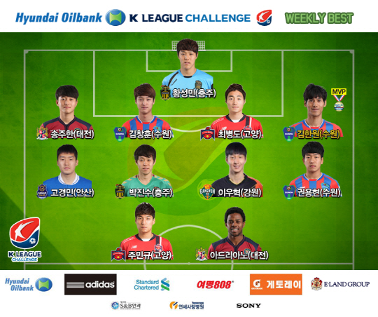 이번 라운드 베스트 11도 공개됐다. 아드리아노(대전)와 주민규(고양)이 최고의 공격수로 뽑힌 가운데 베스트 미드필더에는 권용현(수원FC) 이우혁(강원) 박진수(충주) 고경민(안산)이 선정됐다. 최고의 수비수는 김한원을 비롯해 최병도(고양) 김창훈(수원FC) 송주한(대전)이, 베스트 수문장 자리는 충주의 황성민에게 돌아갔다. 이번 라운드 베스트 매치는 안양-수원FC전이었고, 베스트 팀은 수원FC였다.