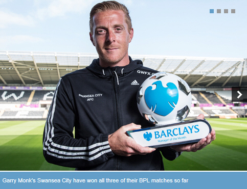 기성용(스완지시티)의 옛 동료이자 스승인 게리 몽크 스완지시티 감독이 잉글랜드 프리미어리그(EPL) 8월의 감독상을 수상했다.