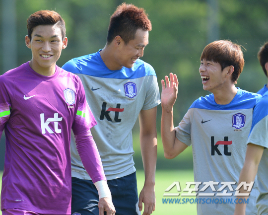 이광종 감독이 이끄는 아시안게임 축구대표팀이 1일 오후 파주 NFC(국가대표축구트레이닝센터)에서 첫 소집 훈련을 가졌다. 윤일록, 김신욱, 김승규가 이야기를 나누며 웃고 있다. 28년 만의 아시안게임 금메달을 노리는 이광종호는 2주간 훈련을 한 뒤 14일 문학경기장에서 말레이지아를 상대로 조별리그 첫 경기를 치른다. 파주=정재근 기자cjg@sportschosun.com/2014.09.01/