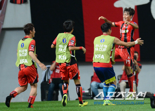 FC서울과 포항스틸러스이 '2014 하나은행 FA컵' 16강전 경기가 16일 서울월드컵 경기장에서 열렸다. FC서울 윤주태가 동점골을 성공시키고 환호하고 있다. 상암=최문영 기자 deer@sportschosun.com /2014.05.16/