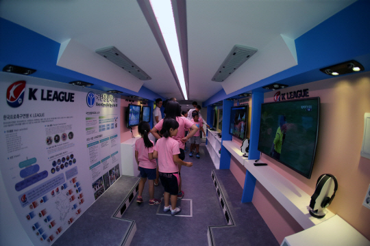 ◇움직이는 체육관 '스포츠버스'를 체험하고 있는 대월초등학교 학생들. 사진제공=프로축구연맹