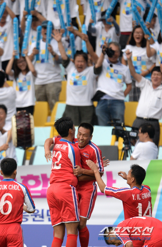 철저한 준비 때문이었을까. 그라운드는 북한의 독무대였다. 경기시작 9분 만에 심현진이 아크 오른쪽에서 호쾌한 오른발슛으로 골망을 갈랐다. 후반 1분 서경진의 추가골에 이어 9분 뒤 리혁철의 쐐기골까지 터지면서 일찌감치 승부가 갈렸다. 2000여 관중들의 환호와 중국 선수단과 취재진의 탄식이 엇갈렸다. 승부는 북한의 3대0 완승으로 끝났다. 북한이 속한 F조는 A~E조와 달리 3개 팀이 한 조에 묶여 있다. 중국전 승리로 북한은 18일 화성에서 열릴 파키스탄과의 F조 최종전 승리하면 조 1위로 16강에 오른다.