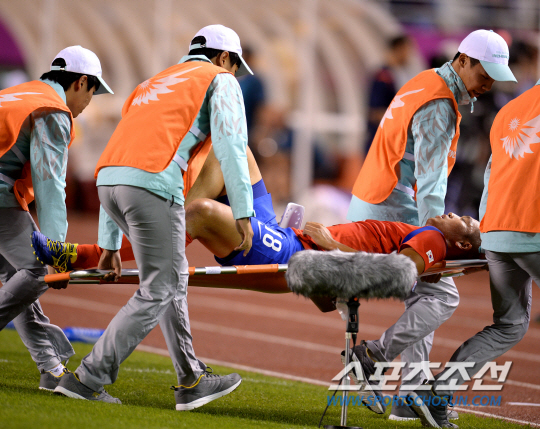 한국과 사우디아라비아의 2014 인천아시안게임 축구 조별리그 예선전이 17일 안산 와스타디움에서 열렸다. 김신욱이 전반 부상을 당해 들것에 실려나가고 있다.