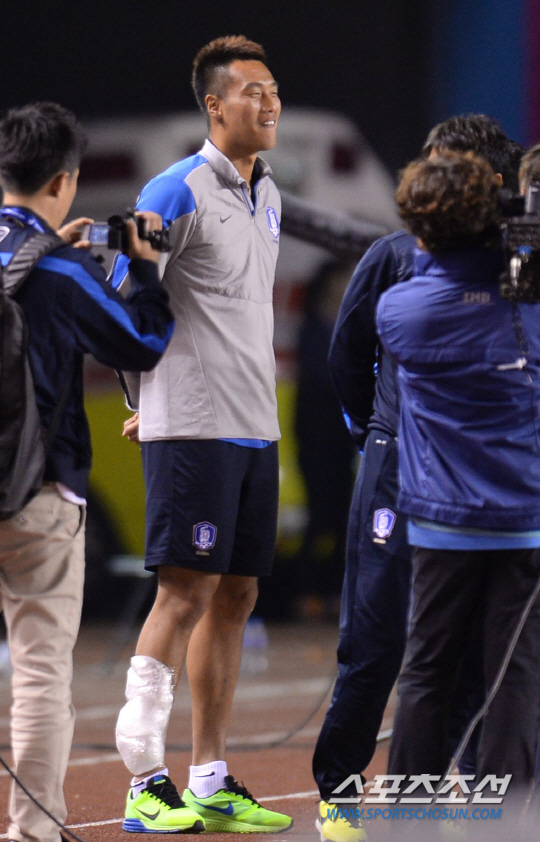 한국과 사우디아라비아의 2014 인천아시안게임 축구 조별리그 예선전이 17일 안산 와스타디움에서 열렸다. 한국이 1-0의 승리를 거둔 가운데 전반에 부상을 당해 빠진 김신욱이 발목에 아이싱을 한 채 웃고 있다.