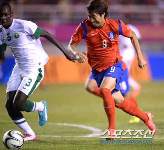 한국과 사우디아라비아의 2014 인천아시안게임 축구 조별리그 예선전이 17일 안산 와스타디움에서 열렸다. 이용재가 사우디 선수를 제치며 돌파를 시도하고 있다.