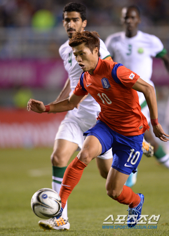 한국과 사우디아라비아의 2014 인천아시안게임 축구 조별리그 예선전이 17일 안산 와스타디움에서 열렸다. 김승대가 사우디 문전에서 돌파를 시도하고 있다.