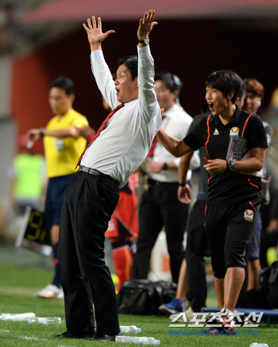 FC서울과 인천 유나이티드의 K리그 클래식 2014 21라운드 경기가 16일 서울월드컵경기장에서 열렸다. 후반 서울 이상협이 팀의 다섯번째골을 터뜨렸다. 이상협의 골이 터지자 기뻐하는 최용수 감독의 모습. 상암=허상욱 기자 wook@sportschosun.com/2014.08.16/