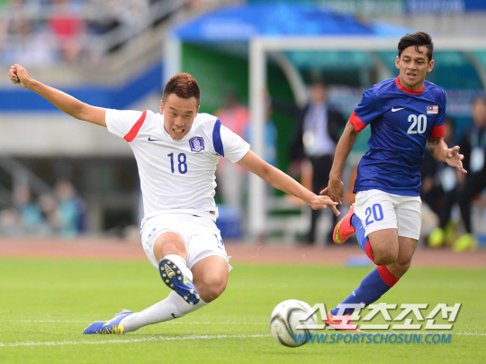 인천아시안게임 축구 조별리그 예선전 한국과 말레이지아의 경기가 14일 문학경기장에서 열렸다. 한국 김신욱이 패스를 받아 날카로운 슈팅을 시도하고 있다. 인천=정재근 기자cjg@sportschosun.com/2014.09.14/