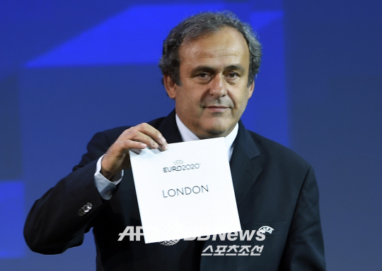 | ◇미셸 플라티니 회장이 유로 2020 결승전 장소로 런던 카드를 뽑고 있다. 제네바(스위스)=ⓒAFPBBNews = News1 |